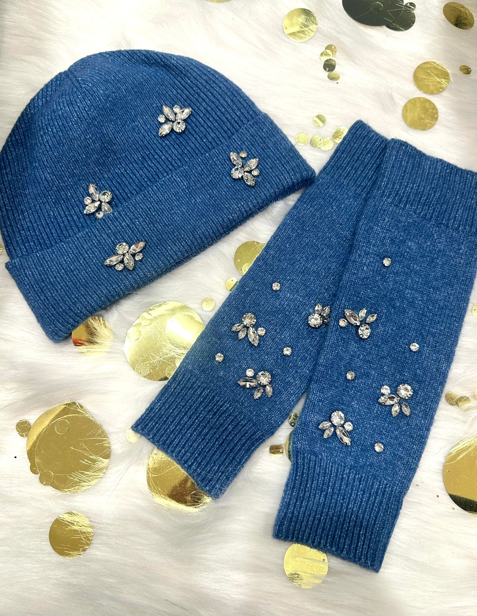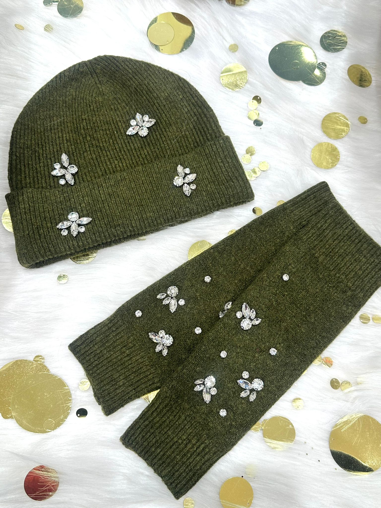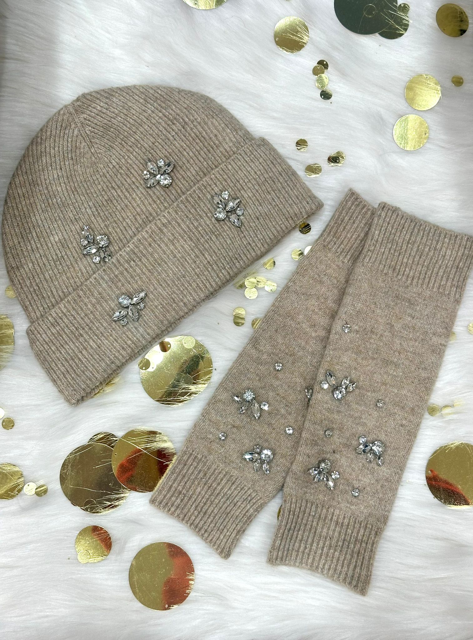 Set con berretto + guanti a manicotto con applicazioni in strass.