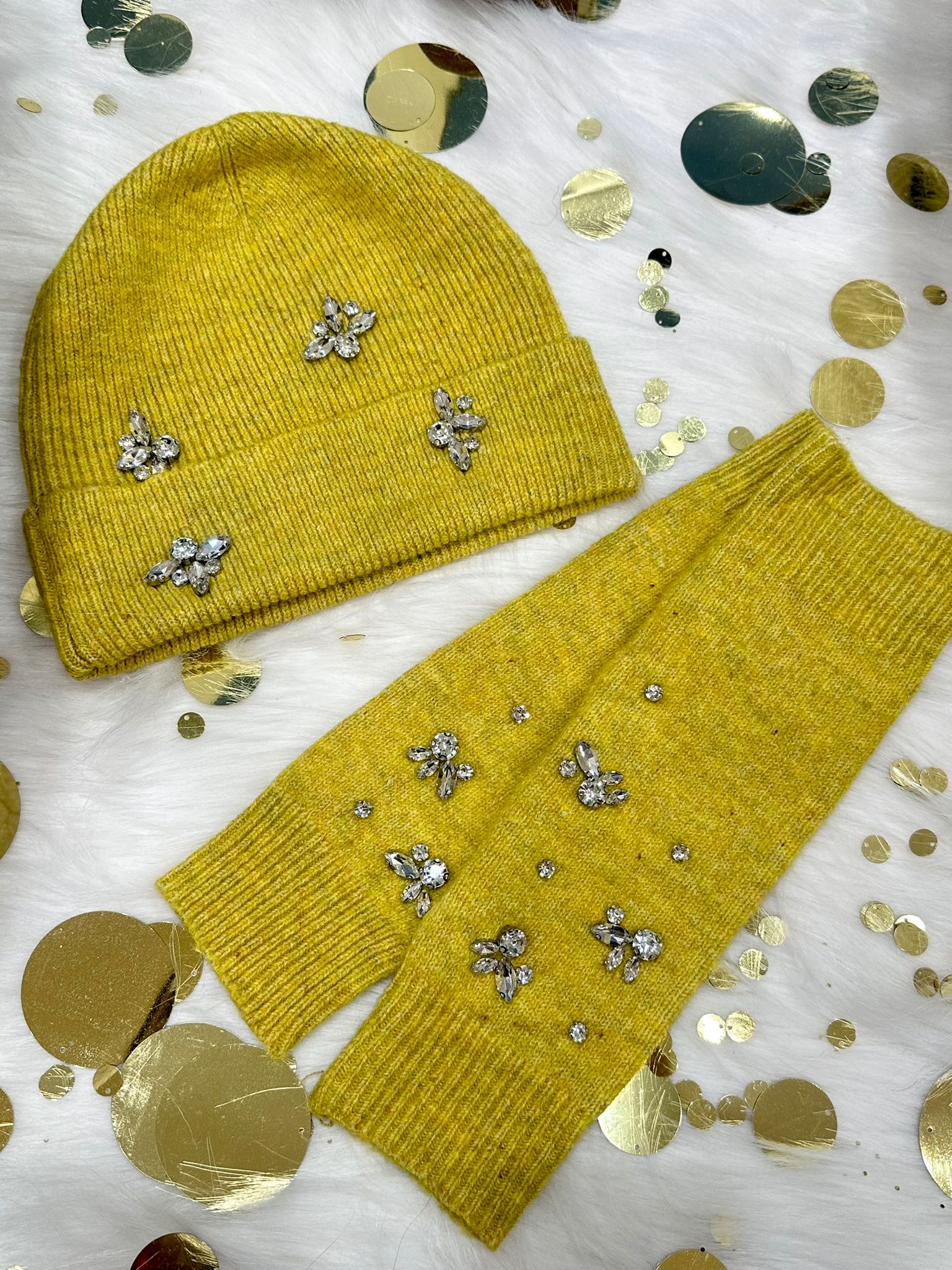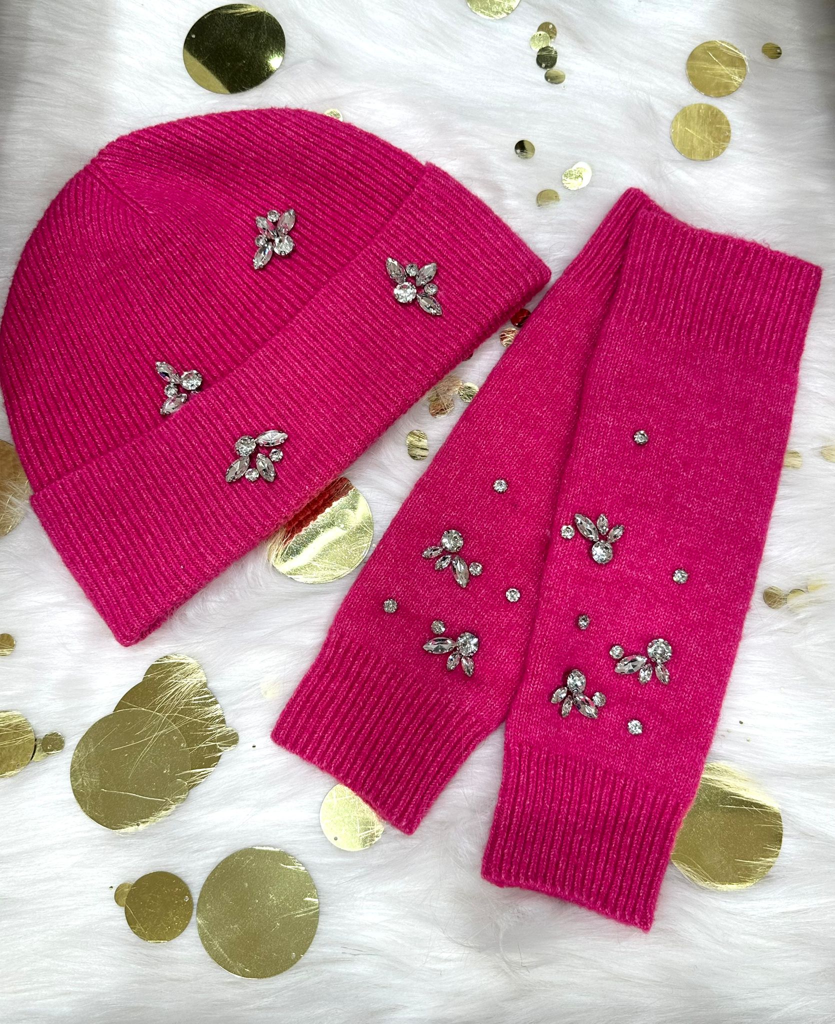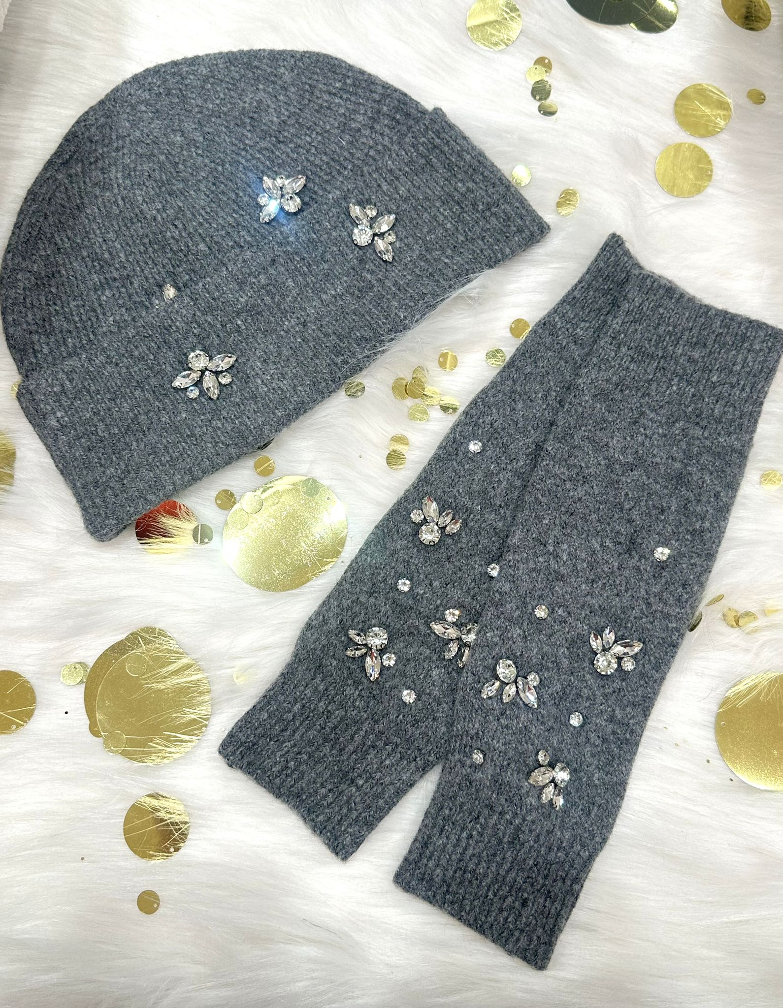Set con berretto + guanti a manicotto con applicazioni in strass.
