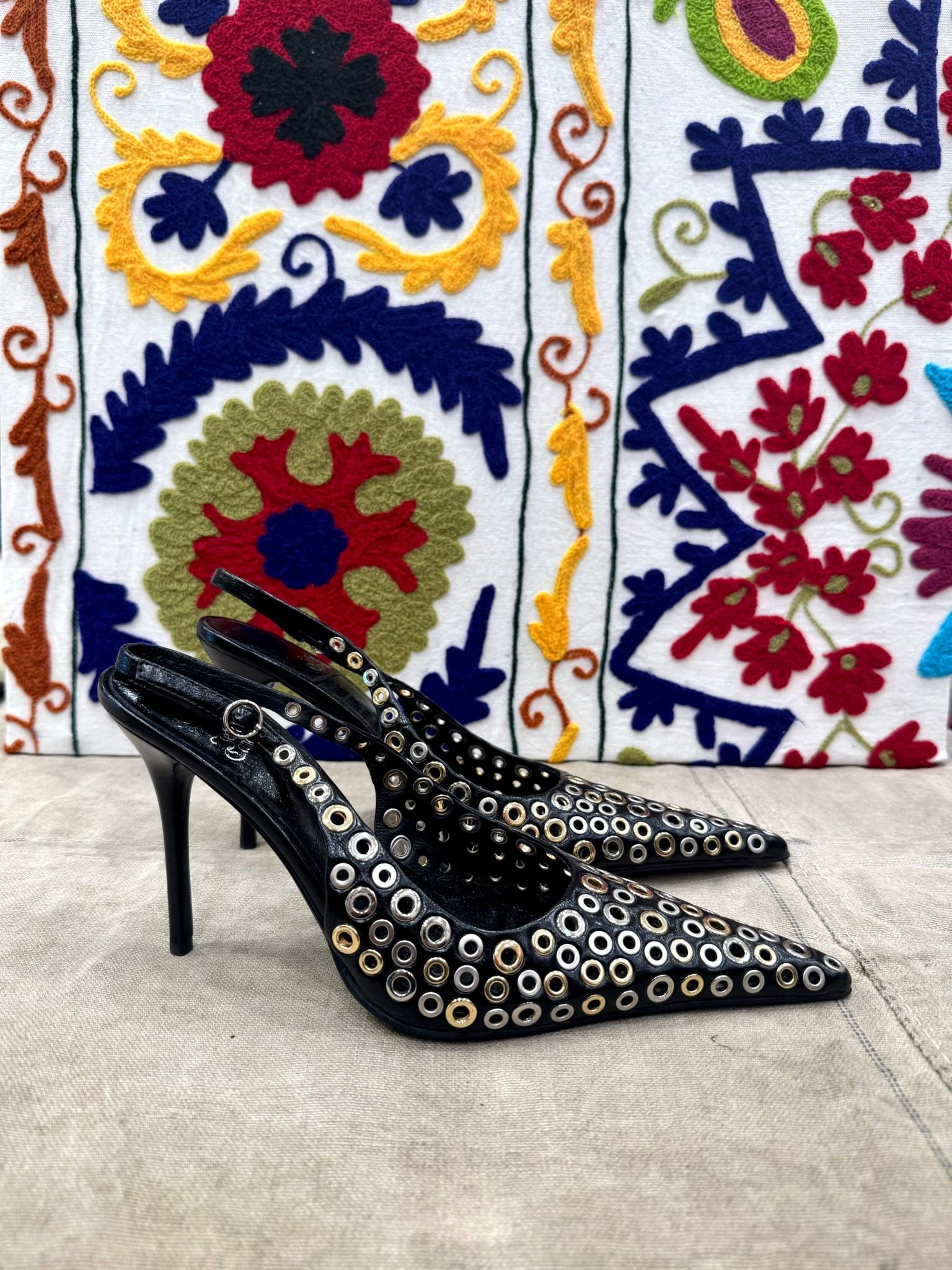 Slingback in pelle nera con dettagli borchie all over - silhouette modera e cool. Tacco 9,5 cm